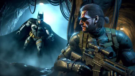 From his vantage point, Solid Snake watched Batman. The Dark Knight was hunched